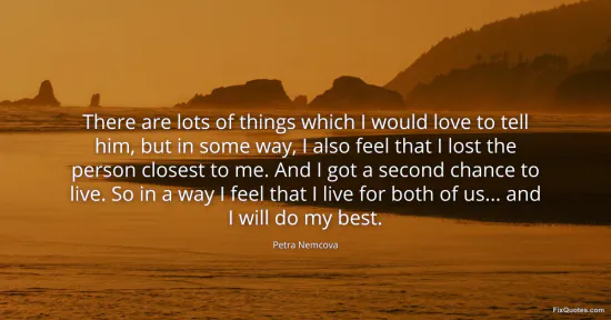 Nemcova, Petra. "There are lots of things which I would love to tell him, but in some way, I also feel that I lost the person closest to me. And I got a second chance to live. So in a way I feel that I live for both of us... and I will do my best." FixQuotes. January 15, 2026. https://fixquotes.com/quotes/there-are-lots-of-things-which-i-would-love-to-170994/.