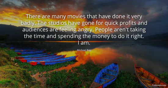 Bay, Michael. "There are many movies that have done it very badly. The studios have gone for quick profits and audiences are feeling angry. People aren't taking the time and spending the money to do it right. I am." FixQuotes. January 16, 2026. https://fixquotes.com/quotes/there-are-many-movies-that-have-done-it-very-88986/.
