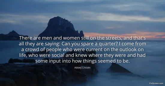Lincoln, Abbey. "There are men and women still on the streets, and that's all they are saying: Can you spare a quarter? I come from a crowd of people who were current on the outlook on life, who were social and knew where they were and had some input into how things seemed to be." FixQuotes. February 19, 2026. https://fixquotes.com/quotes/there-are-men-and-women-still-on-the-streets-and-56845/.