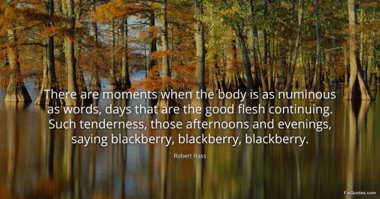 Hass, Robert. "There are moments when the body is as numinous as words, days that are the good flesh continuing. Such tenderness, those afternoons and evenings, saying blackberry, blackberry, blackberry." FixQuotes. January 17, 2026. https://fixquotes.com/quotes/there-are-moments-when-the-body-is-as-numinous-as-77024/.