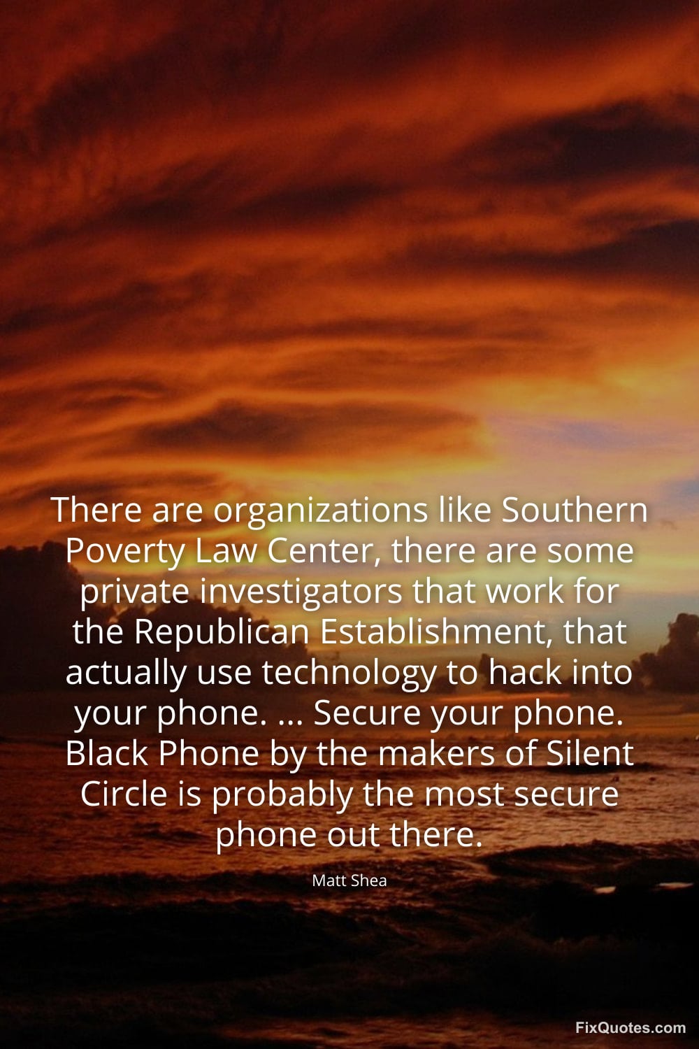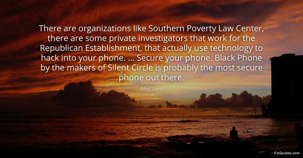 Shea, Matt. "There are organizations like Southern Poverty Law Center, there are some private investigators that work for the Republican Establishment, that actually use technology to hack into your phone. ... Secure your phone. Black Phone by the makers of Silent Circle is probably the most secure phone out there." FixQuotes. February 9, 2026. https://fixquotes.com/quotes/there-are-organizations-like-southern-poverty-law-185006/.