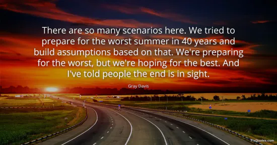 Davis, Gray. "There are so many scenarios here. We tried to prepare for the worst summer in 40 years and build assumptions based on that. We're preparing for the worst, but we're hoping for the best. And I've told people the end is in sight." FixQuotes. January 15, 2026. https://fixquotes.com/quotes/there-are-so-many-scenarios-here-we-tried-to-149499/.