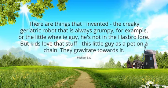 Bay, Michael. "There are things that I invented - the creaky geriatric robot that is always grumpy, for example, or the little wheelie guy, he's not in the Hasbro lore. But kids love that stuff - this little guy as a pet on a chain. They gravitate towards it." FixQuotes. January 16, 2026. https://fixquotes.com/quotes/there-are-things-that-i-invented-the-creaky-99770/.