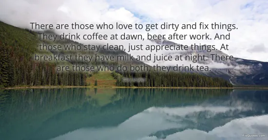 "There are those who love to get dirty and fix things. They drink coffee at dawn, beer after work. And those who stay clean, just appreciate things. At breakfast they have milk and juice at night. There are those who do both, they drink tea." FixQuotes, 16 Jan. 2026, https://fixquotes.com/quotes/there-are-those-who-love-to-get-dirty-and-fix-114613/. Accessed 12 Feb. 2026.