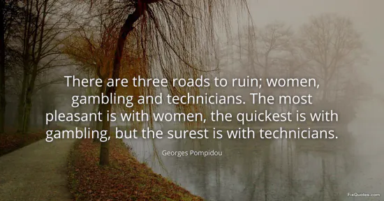 Pompidou, Georges. (2026, January 14). There are three roads to ruin; women, gambling and technicians. The most pleasant is with women, the quickest is with gambling, but the surest is with technicians. FixQuotes. https://fixquotes.com/quotes/there-are-three-roads-to-ruin-women-gambling-and-163589/
