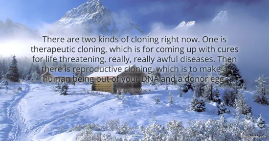 Moore, Mary Tyler. (2026, February 18). There are two kinds of cloning right now. One is therapeutic cloning, which is for coming up with cures for life threatening, really, really awful diseases. Then there is reproductive cloning, which is to make a human being out of your DNA and a donor egg. FixQuotes. https://fixquotes.com/quotes/there-are-two-kinds-of-cloning-right-now-one-is-100298/