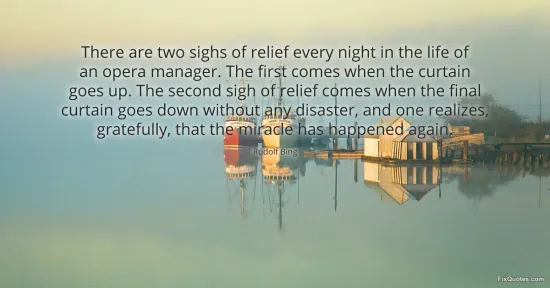 Bing, Rudolf. (2026, February 16). There are two sighs of relief every night in the life of an opera manager. The first comes when the curtain goes up. The second sigh of relief comes when the final curtain goes down without any disaster, and one realizes, gratefully, that the miracle has happened again. FixQuotes. https://fixquotes.com/quotes/there-are-two-sighs-of-relief-every-night-in-the-136578/