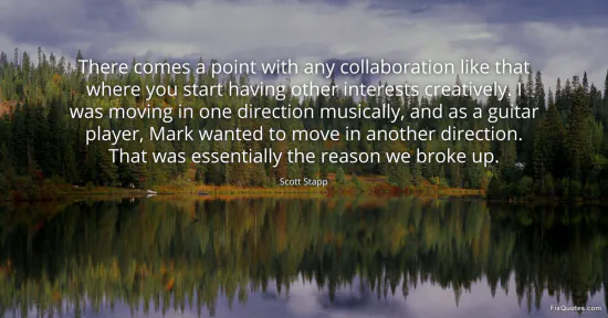Stapp, Scott. "There comes a point with any collaboration like that where you start having other interests creatively. I was moving in one direction musically, and as a guitar player, Mark wanted to move in another direction. That was essentially the reason we broke up." FixQuotes. January 17, 2026. https://fixquotes.com/quotes/there-comes-a-point-with-any-collaboration-like-73621/.