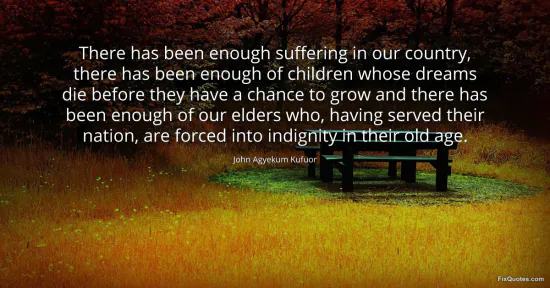 Kufuor, John Agyekum. "There has been enough suffering in our country, there has been enough of children whose dreams die before they have a chance to grow and there has been enough of our elders who, having served their nation, are forced into indignity in their old age." FixQuotes. January 16, 2026. https://fixquotes.com/quotes/there-has-been-enough-suffering-in-our-country-83679/.