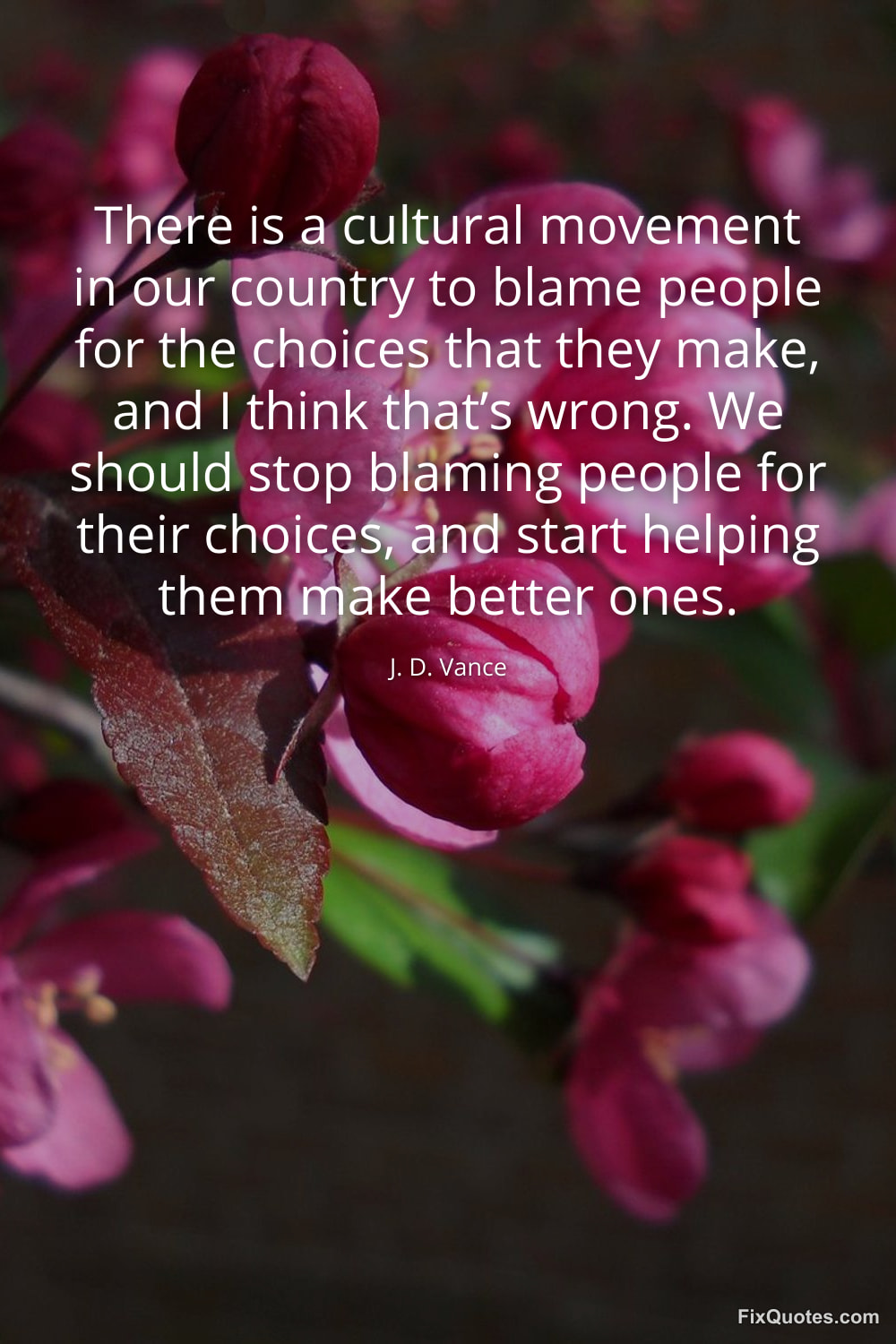 Vance, J. D. "There is a cultural movement in our country to blame people for the choices that they make, and I think that’s wrong. We should stop blaming people for their choices, and start helping them make better ones." FixQuotes. January 25, 2026. https://fixquotes.com/quotes/there-is-a-cultural-movement-in-our-country-to-184139/.