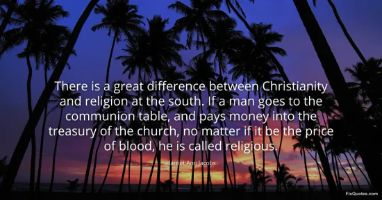 Jacobs, Harriet Ann. (2026, January 17). There is a great difference between Christianity and religion at the south. If a man goes to the communion table, and pays money into the treasury of the church, no matter if it be the price of blood, he is called religious. FixQuotes. https://fixquotes.com/quotes/there-is-a-great-difference-between-christianity-48032/