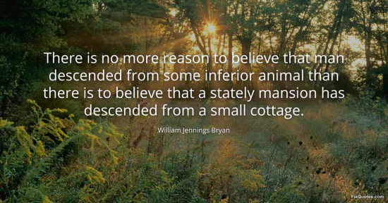 Bryan, William Jennings. (2026, January 15). There is no more reason to believe that man descended from some inferior animal than there is to believe that a stately mansion has descended from a small cottage. FixQuotes. https://fixquotes.com/quotes/there-is-no-more-reason-to-believe-that-man-156970/