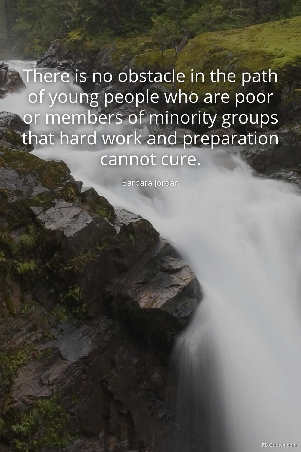 Jordan, Barbara. "There is no obstacle in the path of young people who are poor or members of minority groups that hard work and preparation cannot cure." FixQuotes. January 17, 2026. https://fixquotes.com/quotes/there-is-no-obstacle-in-the-path-of-young-people-38375/.