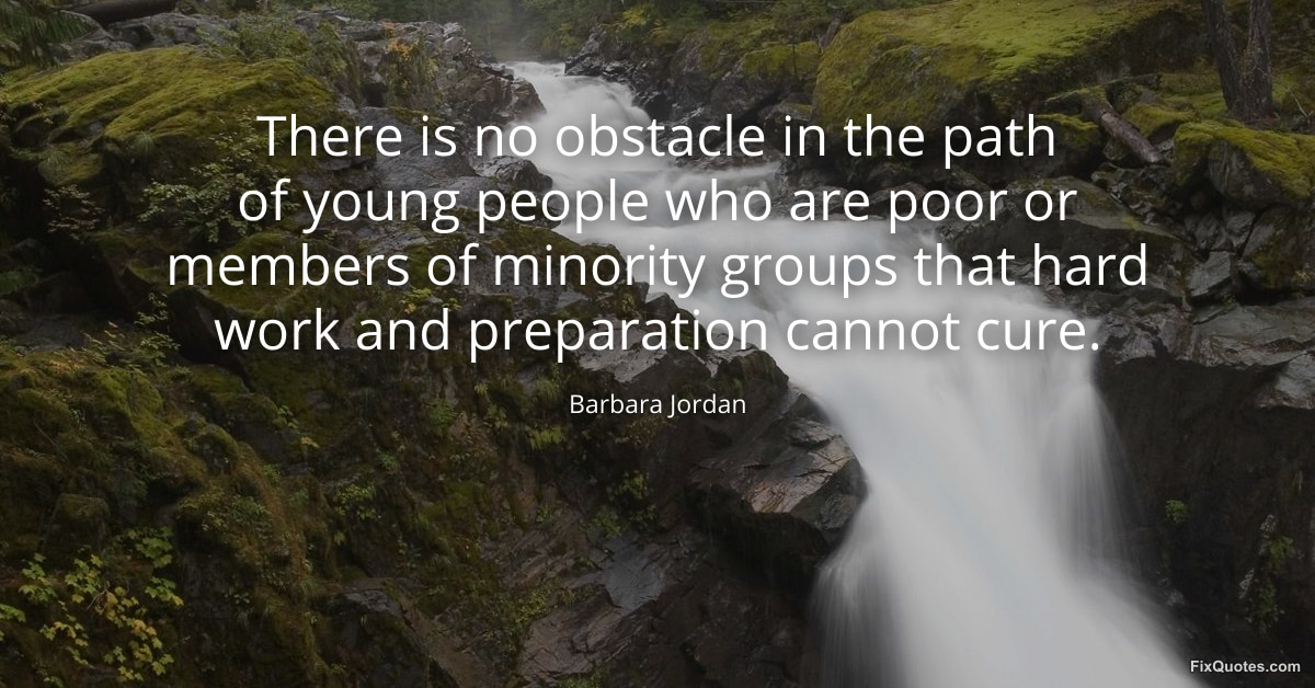 Jordan, Barbara. (2026, January 17). There is no obstacle in the path of young people who are poor or members of minority groups that hard work and preparation cannot cure. FixQuotes. https://fixquotes.com/quotes/there-is-no-obstacle-in-the-path-of-young-people-38375/