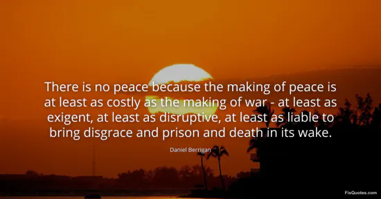 Berrigan, Daniel. (2026, January 15). There is no peace because the making of peace is at least as costly as the making of war - at least as exigent, at least as disruptive, at least as liable to bring disgrace and prison and death in its wake. FixQuotes. https://fixquotes.com/quotes/there-is-no-peace-because-the-making-of-peace-is-158045/