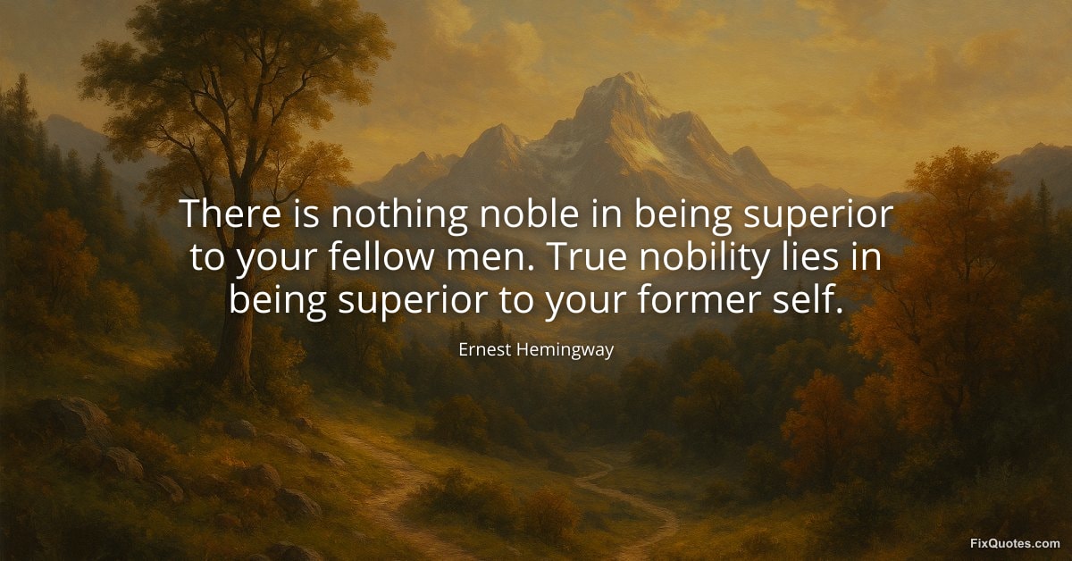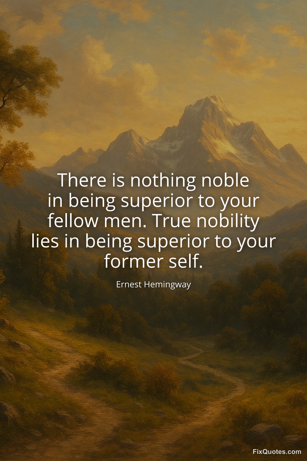 Hemingway’s “nobility” isn’t a medal you pin on yourself for outrunning the crowd; it’s a private yardstick you measure against your own past. The line lands because it smuggles a moral argument into a blunt, almost locker-room cadence. “Superior to your fellow men” is phrased like a challenge, the kind of comparative masculinity Hemingway’s era trained men to chase. Then he flips it: the only contest that isn’t petty is the one you can’t win with applause.