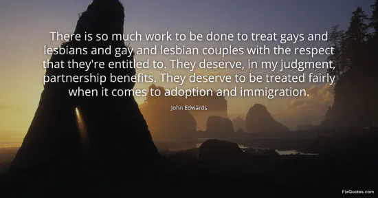 Edwards, John. "There is so much work to be done to treat gays and lesbians and gay and lesbian couples with the respect that they're entitled to. They deserve, in my judgment, partnership benefits. They deserve to be treated fairly when it comes to adoption and immigration." FixQuotes. January 17, 2026. https://fixquotes.com/quotes/there-is-so-much-work-to-be-done-to-treat-gays-75041/.