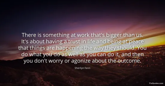 Fenn, Sherilyn. "There is something at work that's bigger than us. It's about having a trust in life and being at peace that things are happening the way they should. You do what you do as well as you can do it, and then you don't worry or agonize about the outcome." FixQuotes. January 16, 2026. https://fixquotes.com/quotes/there-is-something-at-work-thats-bigger-than-us-97516/.