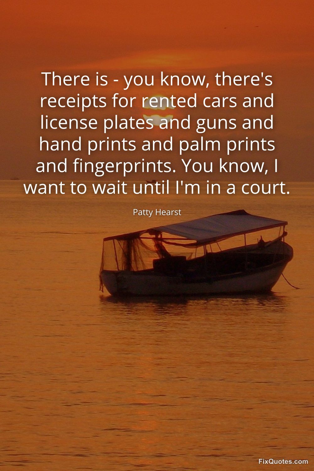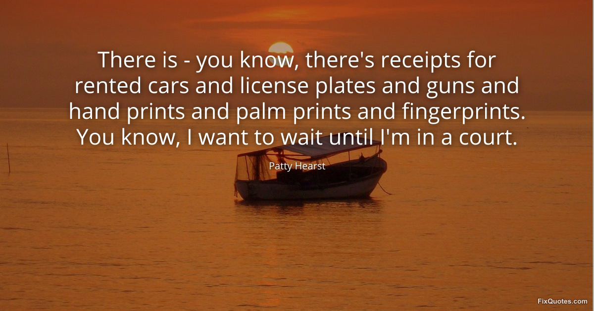 Hearst, Patty. (2026, January 16). There is - you know, there's receipts for rented cars and license plates and guns and hand prints and palm prints and fingerprints. You know, I want to wait until I'm in a court. FixQuotes. https://fixquotes.com/quotes/there-is-you-know-theres-receipts-for-rented-84388/