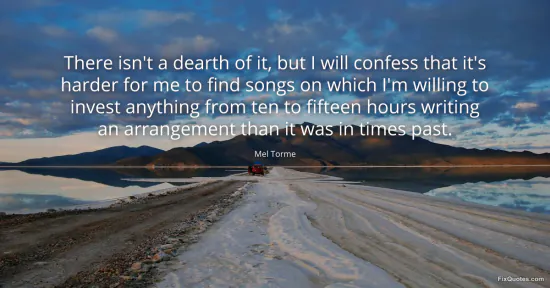 Torme, Mel. (2026, January 16). There isn't a dearth of it, but I will confess that it's harder for me to find songs on which I'm willing to invest anything from ten to fifteen hours writing an arrangement than it was in times past. FixQuotes. https://fixquotes.com/quotes/there-isnt-a-dearth-of-it-but-i-will-confess-that-97146/