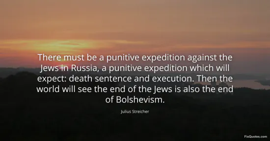 Streicher, Julius. (2026, January 17). There must be a punitive expedition against the Jews in Russia, a punitive expedition which will expect: death sentence and execution. Then the world will see the end of the Jews is also the end of Bolshevism. FixQuotes. https://fixquotes.com/quotes/there-must-be-a-punitive-expedition-against-the-70179/
