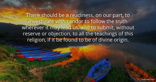 Greenleaf, Simon. "There should be a readiness, on our part, to investigate with candor to follow the truth wherever it may lead us, and to submit, without reserve or objection, to all the teachings of this religion, if it be found to be of divine origin." FixQuotes. January 16, 2026. https://fixquotes.com/quotes/there-should-be-a-readiness-on-our-part-to-102977/.