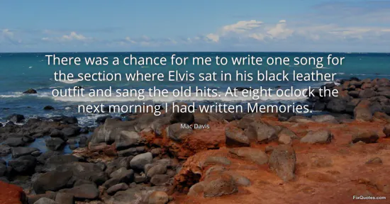 Davis, Mac. "There was a chance for me to write one song for the section where Elvis sat in his black leather outfit and sang the old hits. At eight oclock the next morning I had written Memories." FixQuotes. January 16, 2026. https://fixquotes.com/quotes/there-was-a-chance-for-me-to-write-one-song-for-114947/.