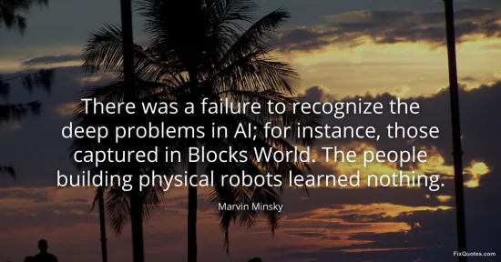 Minsky, Marvin. "There was a failure to recognize the deep problems in AI; for instance, those captured in Blocks World. The people building physical robots learned nothing." FixQuotes. January 15, 2026. https://fixquotes.com/quotes/there-was-a-failure-to-recognize-the-deep-168087/.