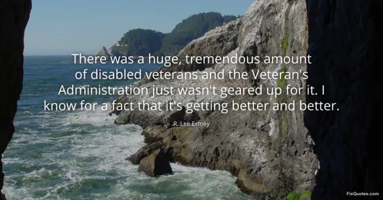 Ermey, R. Lee. "There was a huge, tremendous amount of disabled veterans and the Veteran's Administration just wasn't geared up for it. I know for a fact that it's getting better and better." FixQuotes. January 18, 2026. https://fixquotes.com/quotes/there-was-a-huge-tremendous-amount-of-disabled-12436/.