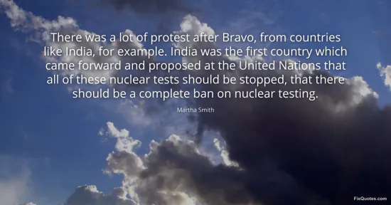 Smith, Martha. "There was a lot of protest after Bravo, from countries like India, for example. India was the first country which came forward and proposed at the United Nations that all of these nuclear tests should be stopped, that there should be a complete ban on nuclear testing." FixQuotes. January 16, 2026. https://fixquotes.com/quotes/there-was-a-lot-of-protest-after-bravo-from-115105/.