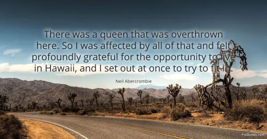 Abercrombie, Neil. "There was a queen that was overthrown here. So I was affected by all of that and felt profoundly grateful for the opportunity to live in Hawaii, and I set out at once to try to fit in." FixQuotes. January 16, 2026. https://fixquotes.com/quotes/there-was-a-queen-that-was-overthrown-here-so-i-118784/.