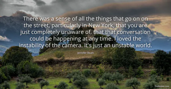 Beals, Jennifer. "There was a sense of all the things that go on on the street, particularly in New York, that you are just completely unaware of, that that conversation could be happening at any time. I loved the instability of the camera. It's just an unstable world." FixQuotes. January 15, 2026. https://fixquotes.com/quotes/there-was-a-sense-of-all-the-things-that-go-on-on-151329/.