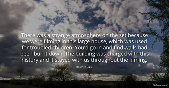 Dalle, Beatrice. "There was a strange atmosphere on the set because we were filming in this large house, which was used for troubled children. You'd go in and find walls had been burnt down. The building was charged with this history and it stayed with us throughout the filming." FixQuotes. January 17, 2026. https://fixquotes.com/quotes/there-was-a-strange-atmosphere-on-the-set-because-74984/.