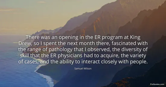 Wilson, Samuel. (2026, January 16). There was an opening in the ER program at King Drew, so I spent the next month there, fascinated with the range of pathology that I observed, the diversity of skill that the ER physicians had to acquire, the variety of cases, and the ability to interact closely with people. FixQuotes. https://fixquotes.com/quotes/there-was-an-opening-in-the-er-program-at-king-85769/