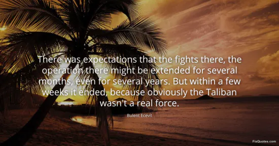 Ecevit, Bulent. "There was expectations that the fights there, the operation there might be extended for several months, even for several years. But within a few weeks it ended, because obviously the Taliban wasn't a real force." FixQuotes. January 17, 2026. https://fixquotes.com/quotes/there-was-expectations-that-the-fights-there-the-38786/.