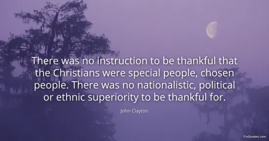 Clayton, John. "There was no instruction to be thankful that the Christians were special people, chosen people. There was no nationalistic, political or ethnic superiority to be thankful for." FixQuotes. January 16, 2026. https://fixquotes.com/quotes/there-was-no-instruction-to-be-thankful-that-the-111126/.