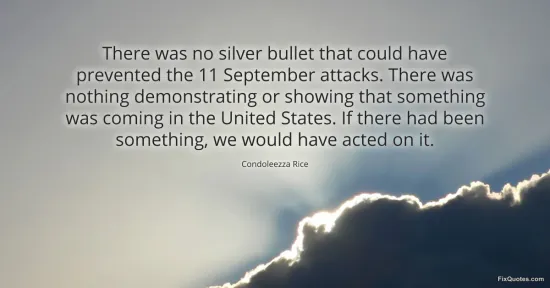Rice, Condoleezza. "There was no silver bullet that could have prevented the 11 September attacks. There was nothing demonstrating or showing that something was coming in the United States. If there had been something, we would have acted on it." FixQuotes. January 18, 2026. https://fixquotes.com/quotes/there-was-no-silver-bullet-that-could-have-5864/.