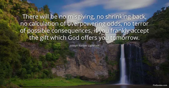 Lightfoot, Joseph Barber. "There will be no misgiving, no shrinking back, no calculation of overpowering odds, no terror of possible consequences, if you frankly accept the gift which God offers you tomorrow." FixQuotes. January 18, 2026. https://fixquotes.com/quotes/there-will-be-no-misgiving-no-shrinking-back-no-13506/.
