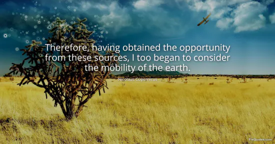 "Therefore, having obtained the opportunity from these sources, I too began to consider the mobility of the earth." FixQuotes, 18 Jan. 2026, https://fixquotes.com/quotes/therefore-having-obtained-the-opportunity-from-11394/. Accessed 12 Feb. 2026.
