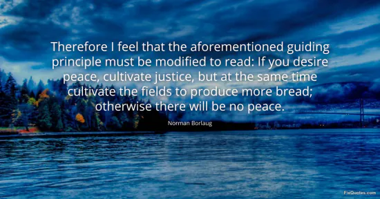 "Therefore I feel that the aforementioned guiding principle must be modified to read: If you desire peace, cultivate justice, but at the same time cultivate the fields to produce more bread; otherwise there will be no peace." FixQuotes, 18 Jan. 2026, https://fixquotes.com/quotes/therefore-i-feel-that-the-aforementioned-guiding-5380/. Accessed 13 Feb. 2026.