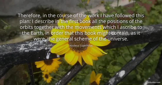 "Therefore, in the course of the work I have followed this plan: I describe in the first book all the positions of the orbits together with the movements which I ascribe to the Earth, in order that this book might contain, as it were, the general scheme of the universe." FixQuotes, 18 Jan. 2026, https://fixquotes.com/quotes/therefore-in-the-course-of-the-work-i-have-11395/. Accessed 22 Feb. 2026.