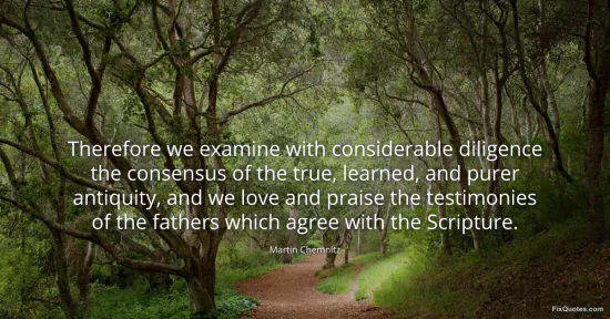 Chemnitz, Martin. (2026, January 18). Therefore we examine with considerable diligence the consensus of the true, learned, and purer antiquity, and we love and praise the testimonies of the fathers which agree with the Scripture. FixQuotes. https://fixquotes.com/quotes/therefore-we-examine-with-considerable-diligence-22728/
