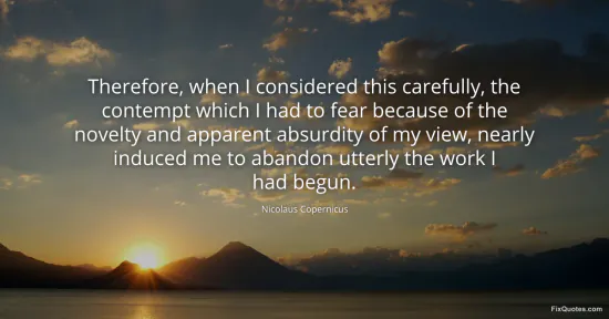 Copernicus, Nicolaus. (2026, January 18). Therefore, when I considered this carefully, the contempt which I had to fear because of the novelty and apparent absurdity of my view, nearly induced me to abandon utterly the work I had begun. FixQuotes. https://fixquotes.com/quotes/therefore-when-i-considered-this-carefully-the-11396/