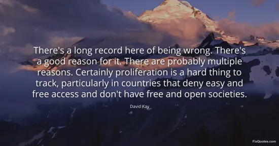 Kay, David. "There's a long record here of being wrong. There's a good reason for it. There are probably multiple reasons. Certainly proliferation is a hard thing to track, particularly in countries that deny easy and free access and don't have free and open societies." FixQuotes. January 15, 2026. https://fixquotes.com/quotes/theres-a-long-record-here-of-being-wrong-theres-a-147593/.