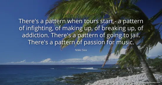 Sixx, Nikki. (2026, January 15). There's a pattern when tours start - a pattern of infighting, of making up, of breaking up, of addiction. There's a pattern of going to jail. There's a pattern of passion for music. FixQuotes. https://fixquotes.com/quotes/theres-a-pattern-when-tours-start-a-pattern-of-155701/