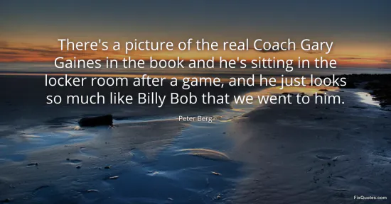 Berg, Peter. "There's a picture of the real Coach Gary Gaines in the book and he's sitting in the locker room after a game, and he just looks so much like Billy Bob that we went to him." FixQuotes. February 17, 2026. https://fixquotes.com/quotes/theres-a-picture-of-the-real-coach-gary-gaines-in-101158/.