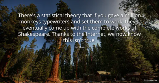 Hart, Ian. (2026, January 15). There's a statistical theory that if you gave a million monkeys typewriters and set them to work, they'd eventually come up with the complete works of Shakespeare. Thanks to the Internet, we now know this isn't true. FixQuotes. https://fixquotes.com/quotes/theres-a-statistical-theory-that-if-you-gave-a-146223/