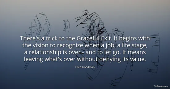 Goodman, Ellen. "There's a trick to the Graceful Exit. It begins with the vision to recognize when a job, a life stage, a relationship is over - and to let go. It means leaving what's over without denying its value." FixQuotes. January 15, 2026. https://fixquotes.com/quotes/theres-a-trick-to-the-graceful-exit-it-begins-53325/.