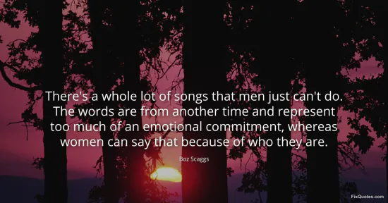 Scaggs, Boz. "There's a whole lot of songs that men just can't do. The words are from another time and represent too much of an emotional commitment, whereas women can say that because of who they are." FixQuotes. January 17, 2026. https://fixquotes.com/quotes/theres-a-whole-lot-of-songs-that-men-just-cant-do-39289/.