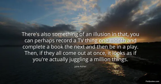 Asher, Jane. "There's also something of an illusion in that, you can perhaps record a TV thing one month and complete a book the next and then be in a play. Then, if they all come out at once, it looks as if you're actually juggling a million things." FixQuotes. January 16, 2026. https://fixquotes.com/quotes/theres-also-something-of-an-illusion-in-that-you-85663/.